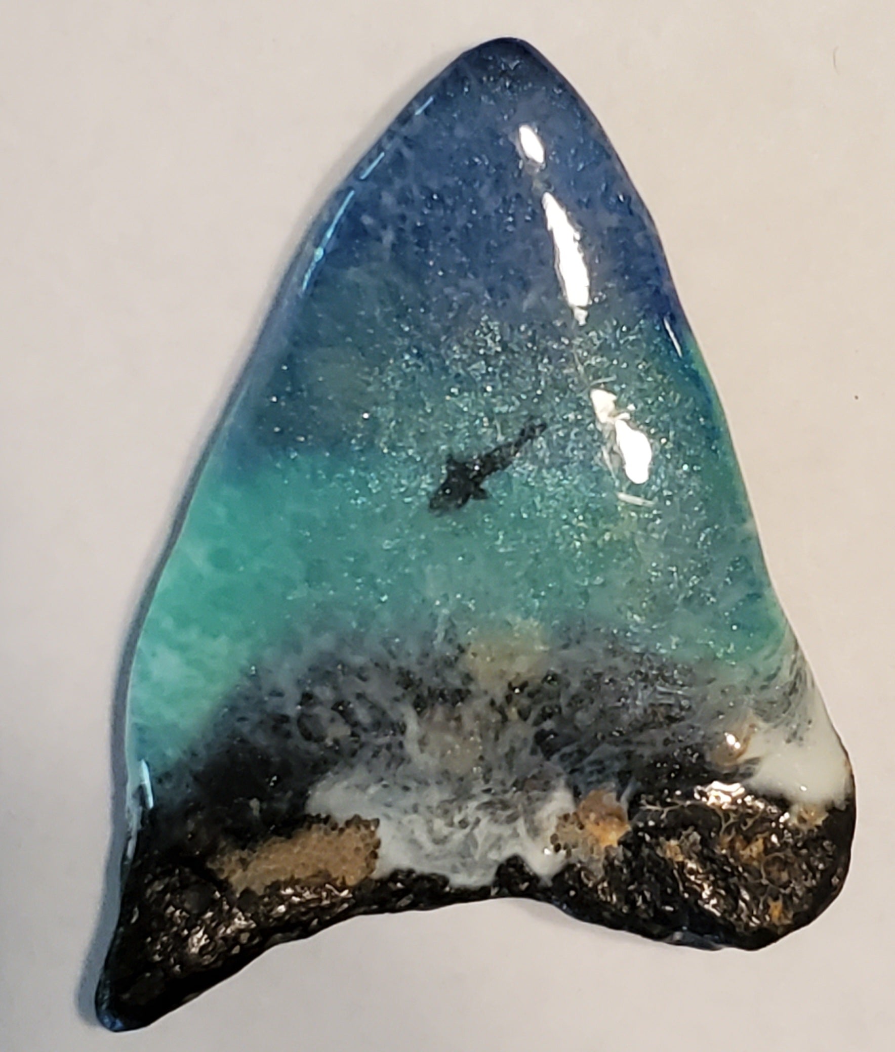 This 1.36"" Megalodon tooth was selected to be used in artwork with skill and talent this tooth is painted on the back with a seascape.