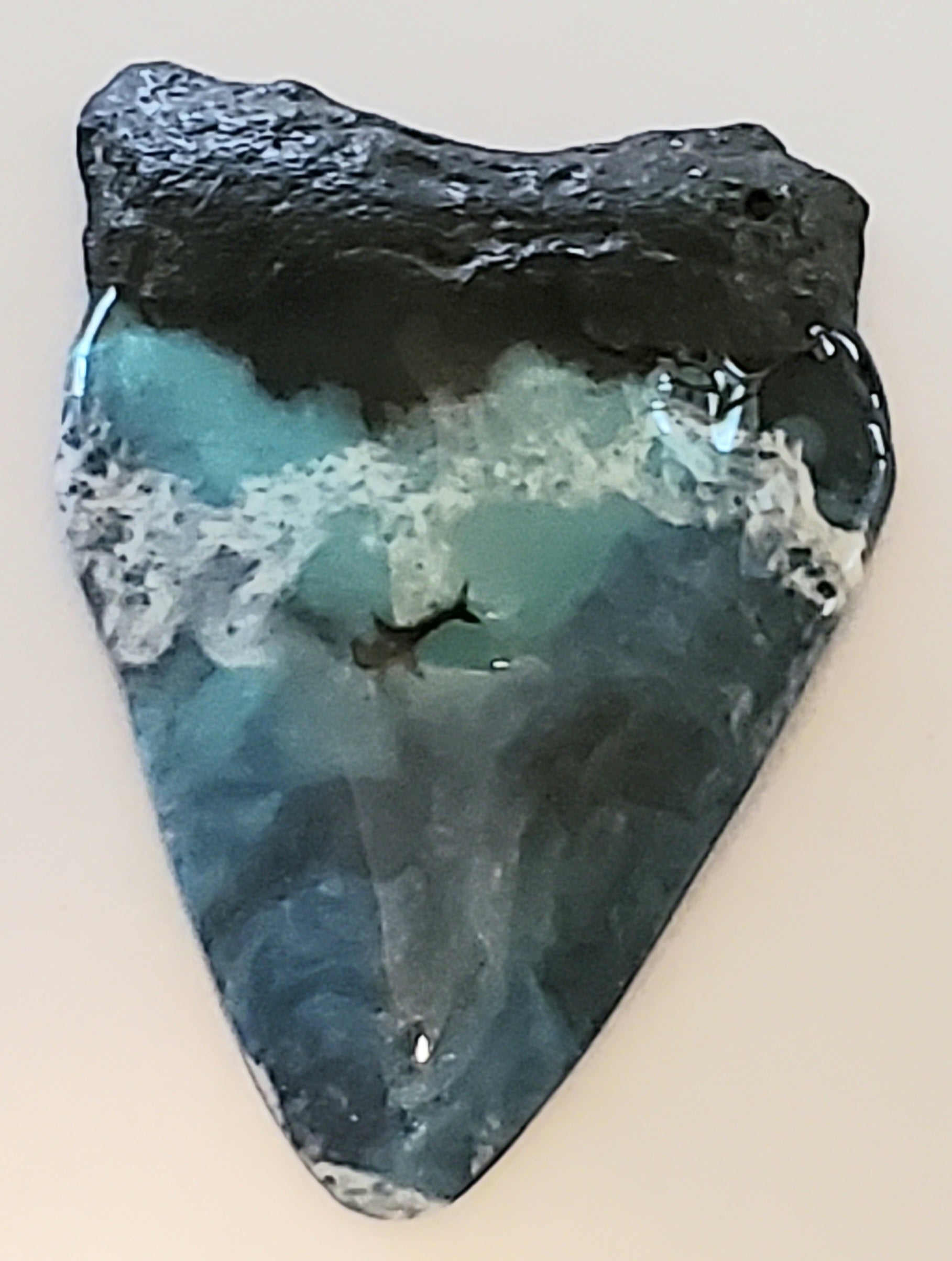 This 2.74" Megalodon tooth was selected to be used in artwork with skill and talent this tooth is painted on the front with a seascape.