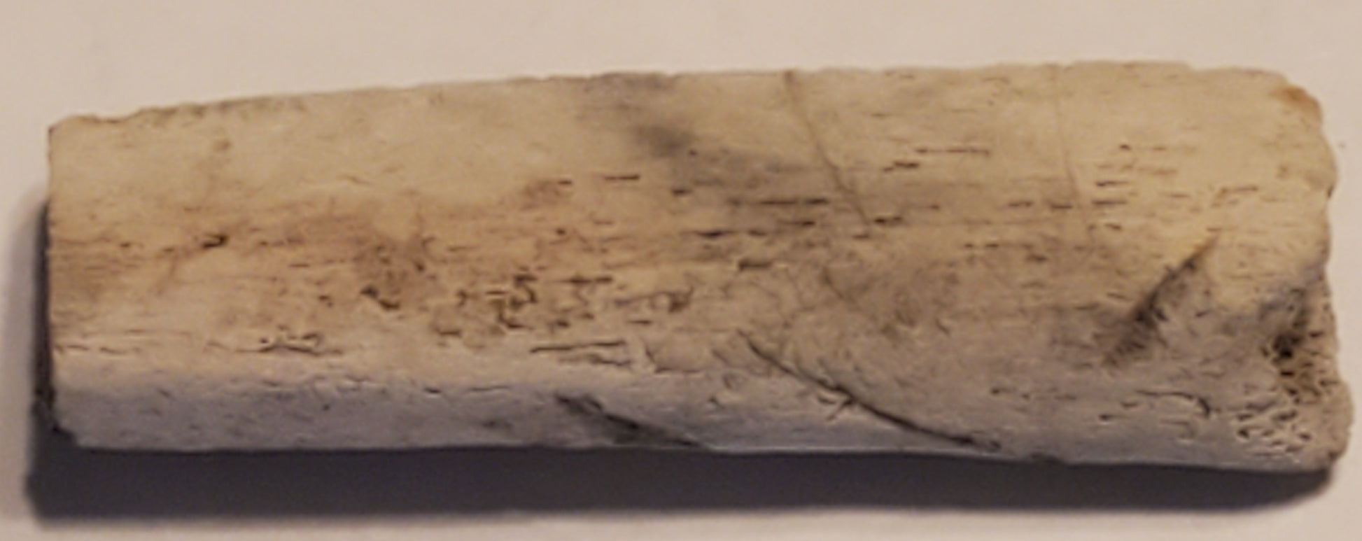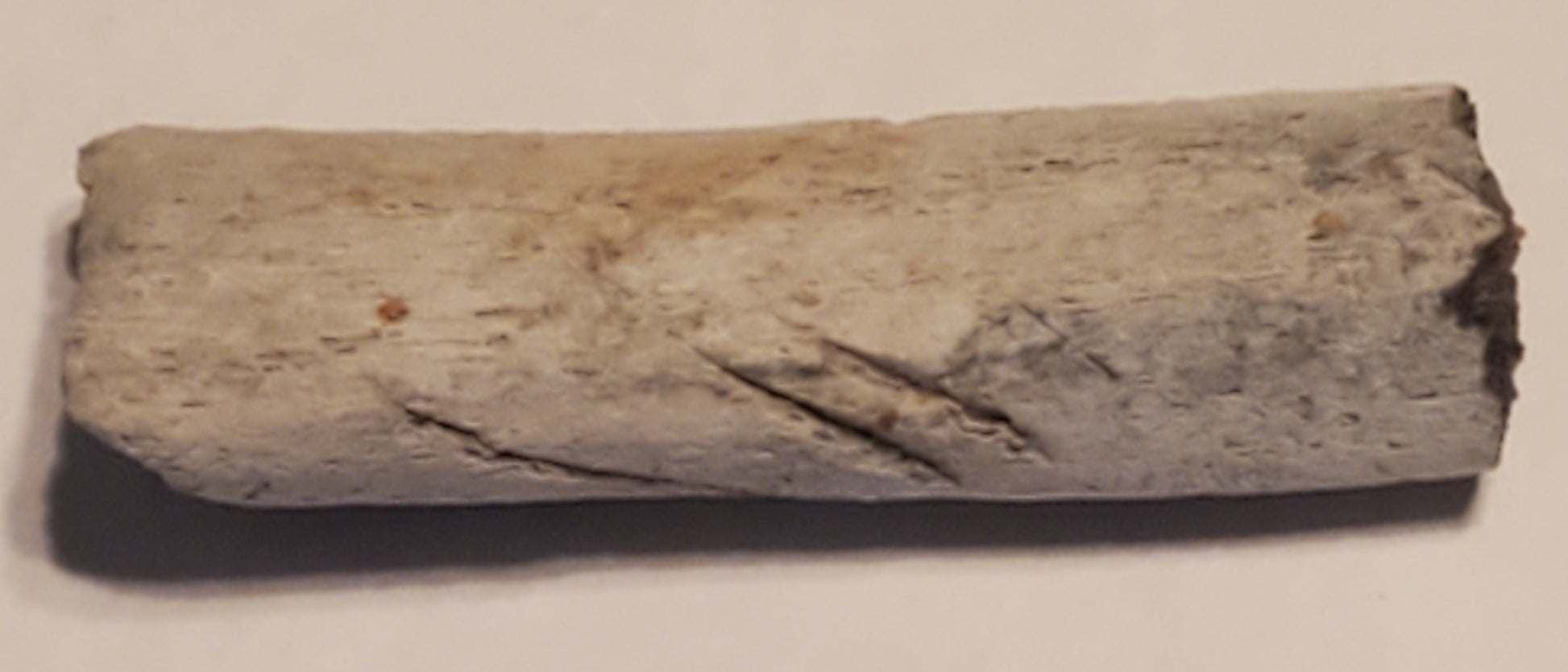 An unmistakable and obvious bite marks on this 2”,section of a fossilized cetacean rib bone from the Yorktown Formation of NC.