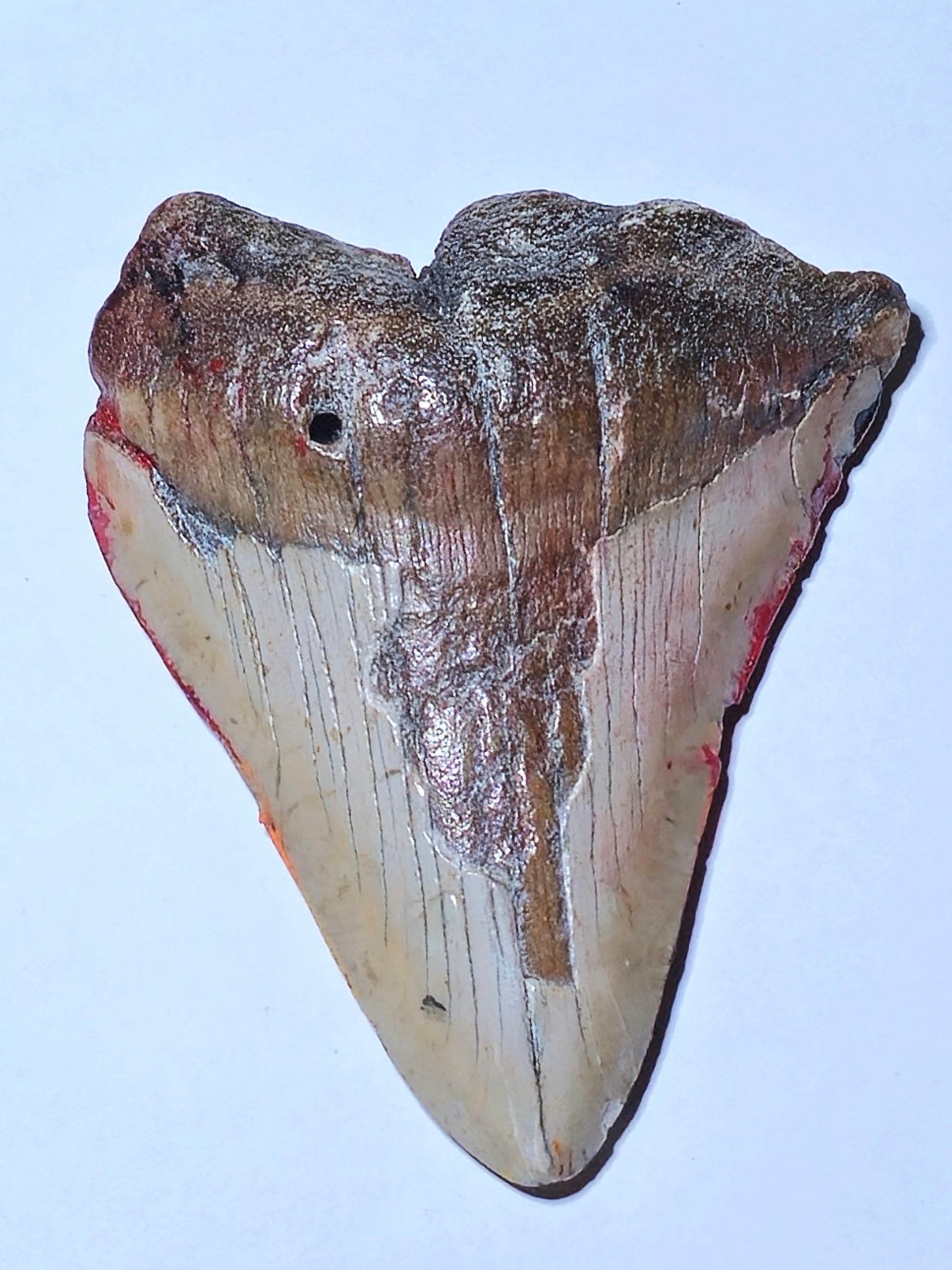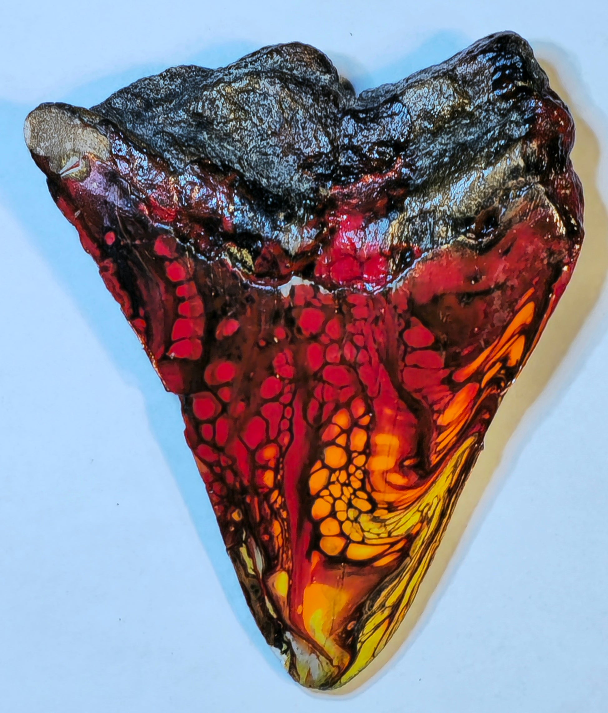 This fantastic 4.12" red & yellow acrylic painted Megalodon tooth created by Kate Asis Teske of Breathing Space Hawaii in acrylic on the back of the tooth. For me, this tooth has a groovy psychedelic 60's feel. A Megalodon lava lamp. Lol