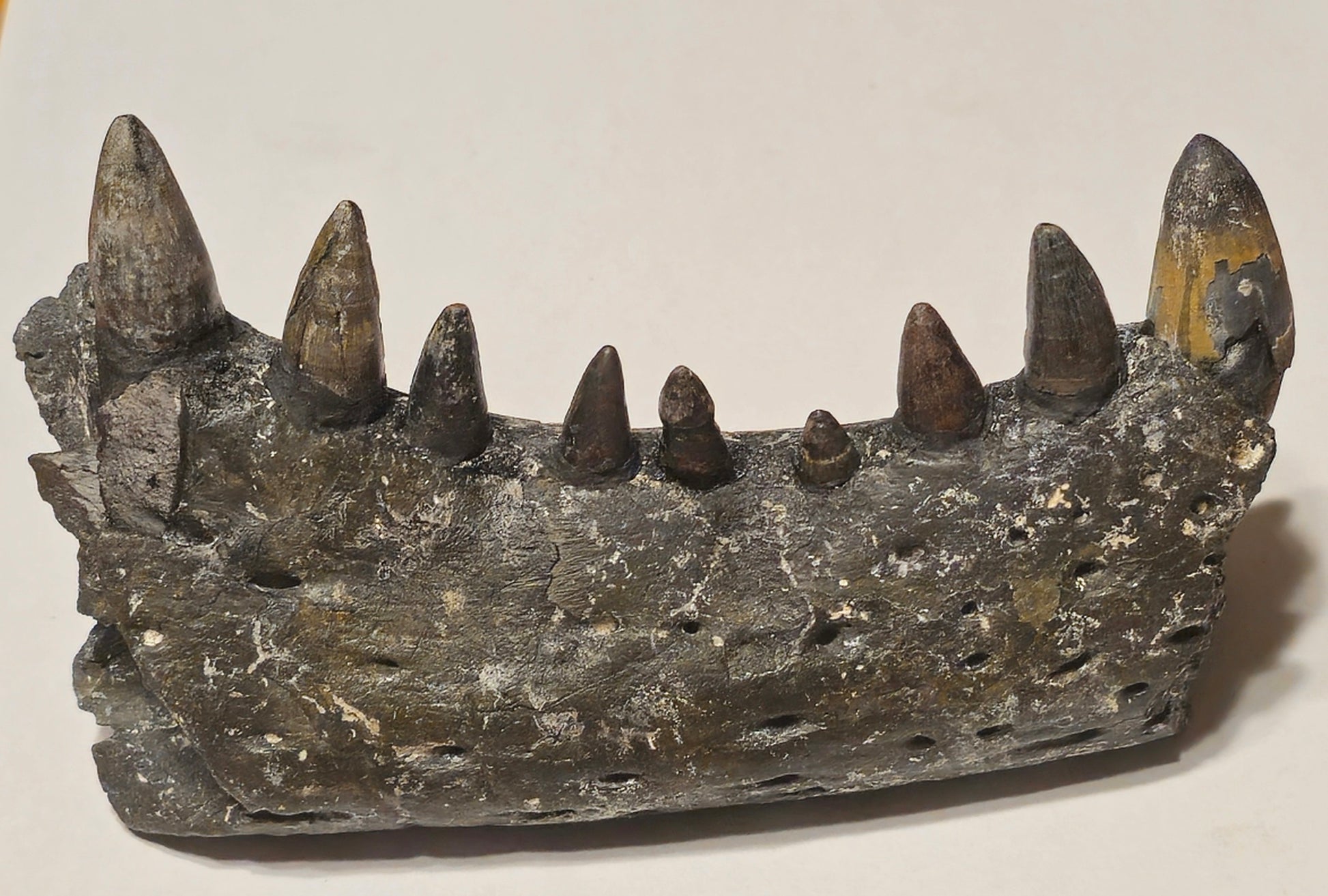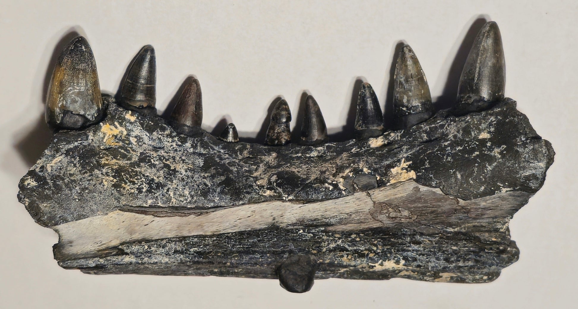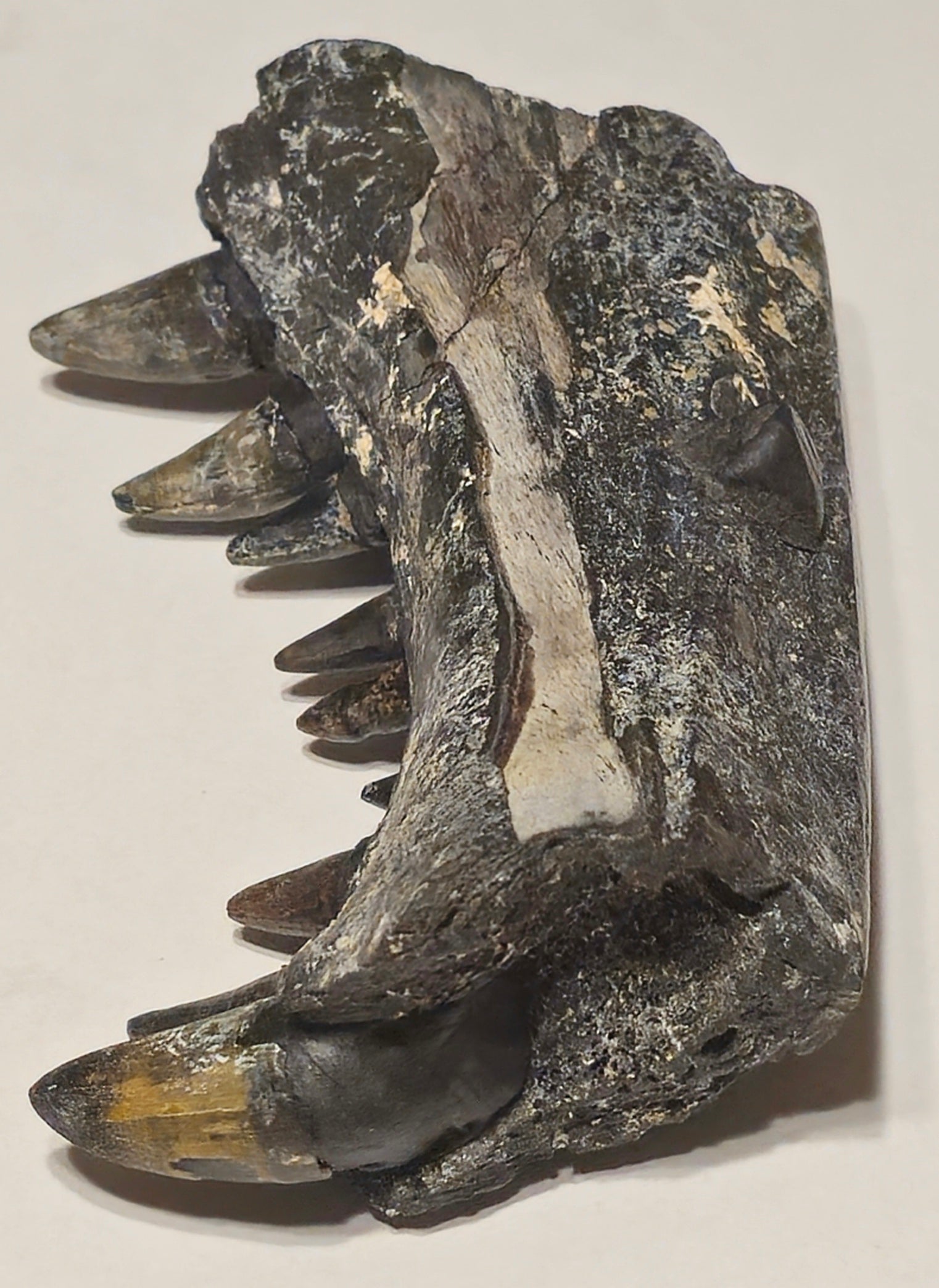 There are nine teeth that were glued into the jaw with reconstructed roots to keep teeth from dropping out of the jaw.