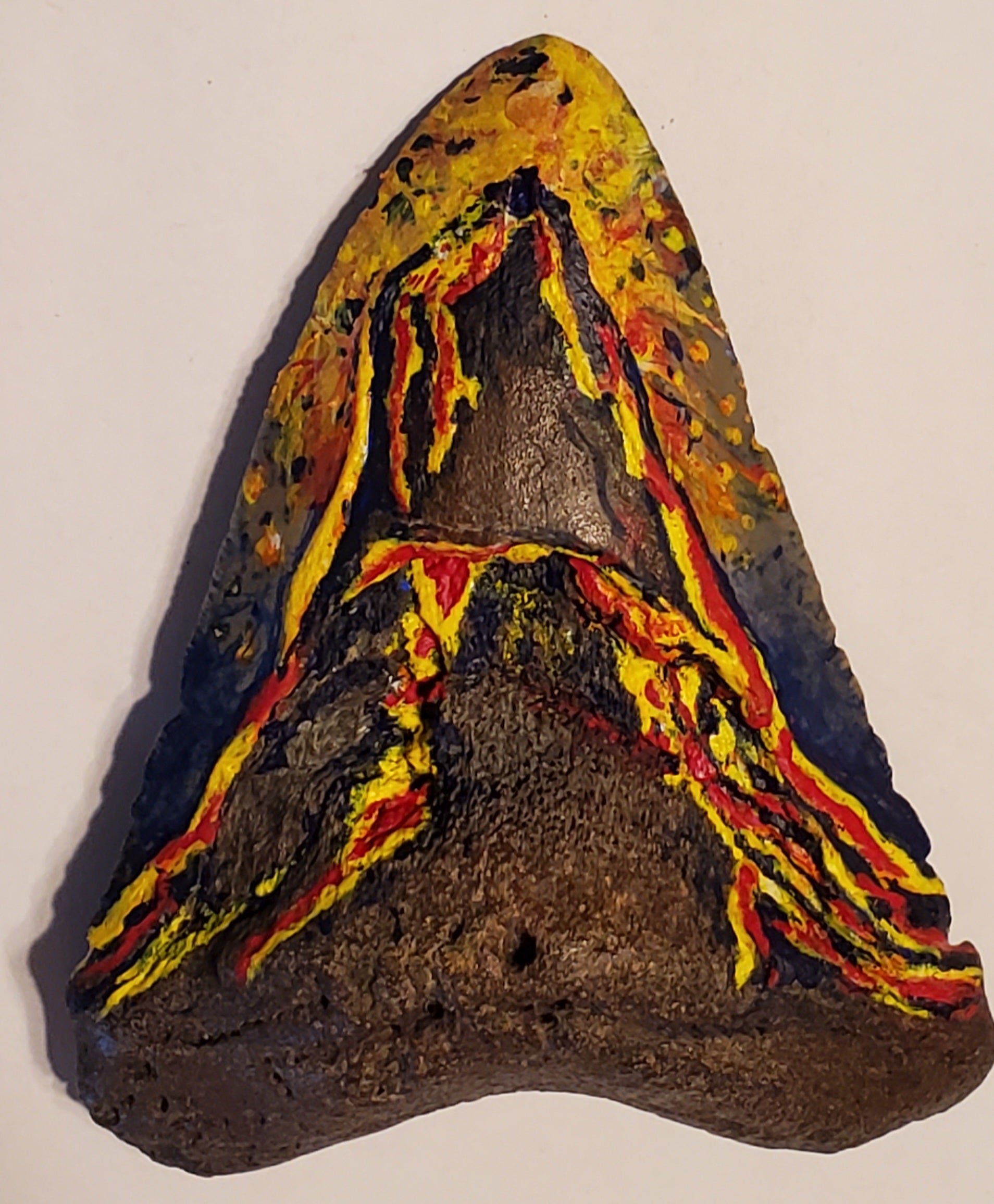 With Mauna Loa showing significant signs of erupting at the moment. Maybe this volcano on a 4.5" Megalodon tooth painted by David Kelly might be in bad taste.